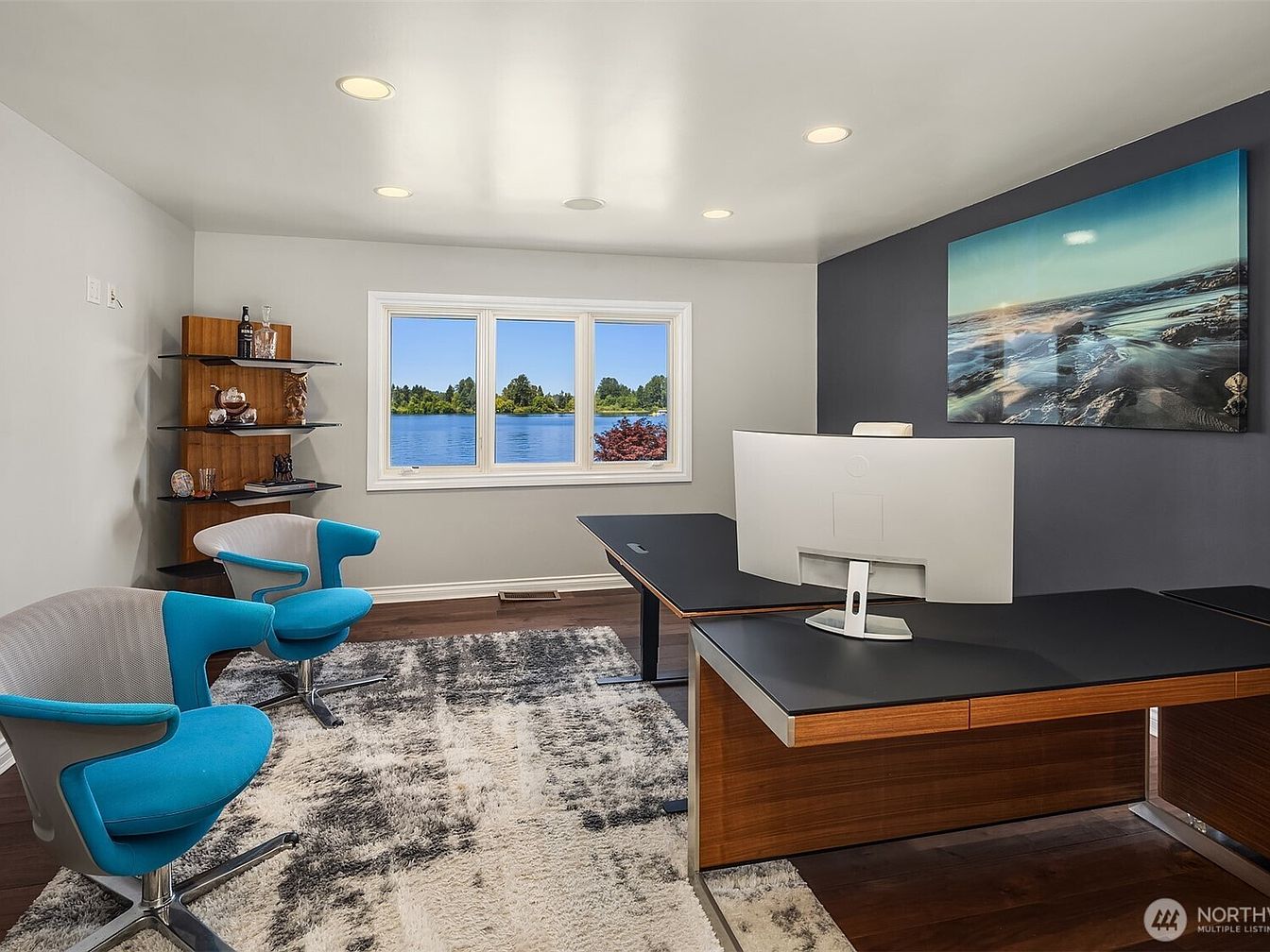 This sleek home office boasts a harmonious blend of modern aesthetics and functionality. The room features a stunning view of the water through expansive windows, inviting natural light while providing a serene backdrop. A stylish dark desk with clean lines complements the warm wooden flooring, while vibrant blue ergonomic chairs add a pop of color and comfort for long working hours. Minimalist shelving displays art and decor, creating a personal touch. Warm neutral walls enhance the spacious feel, fostering a calm and productive environment, perfect for both focused work and creative inspiration.