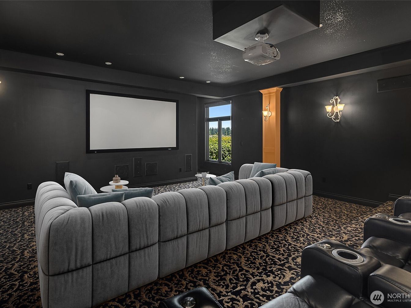 This stylish home theater features an inviting layout with plush, oversized gray seating arranged for optimal viewing, focusing on the large screen opposite. The elegant black walls enhance the cinematic experience, while delicate sconces provide ambient lighting, complementing the cozy atmosphere. The patterned carpet adds a touch of sophistication, perfect for family movie nights. Large windows allow natural light, brightening the space while retaining privacy. Functional elements include integrated sound systems discreetly positioned around the room. This versatile area is designed for both entertainment and relaxation, making it an ideal retreat for family gatherings or a night in.
