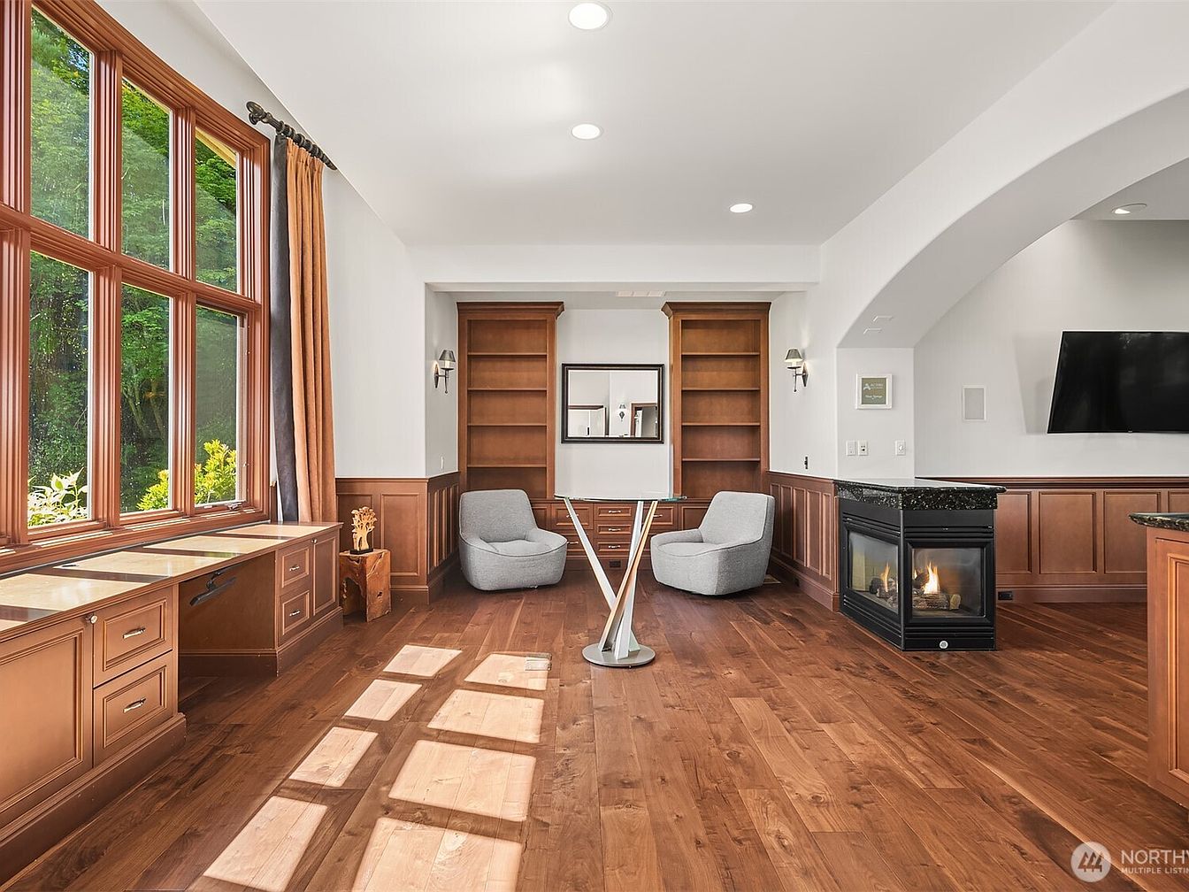 This inviting living space features large, warm windows that flood the room with natural light, enhancing its airy atmosphere. The rich, wooden cabinetry complements the sleek, dark stone fireplace, providing both warmth and elegance. A modern, circular table contrasts with the plush, gray seating, fostering a casual yet sophisticated vibe. Earthy tones dominate the color scheme, promoting a sense of tranquility. Built-in shelves offer functional storage while displaying personal items or art, making it ideal for family gatherings. Ideal for relaxation, this space is versatile, seamlessly blending comfort with style, perfect for creating lasting memories.