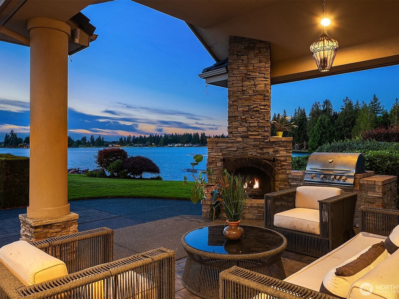 This inviting outdoor living area blends natural beauty with comfort, offering a picturesque view of the serene lake. The space features a cozy stone fireplace as a focal point, perfect for gatherings. A blend of soft, neutral tones adorns the furniture, complemented by rich, woven textures that enhance the warm ambiance. Comfortable seating arrangements provide ample space for family and friends to relax, while a sleek barbecue grill invites outdoor cooking. The elegantly designed stone columns and paved flooring add architectural interest, creating a harmonious balance between luxury and nature in this perfect outdoor retreat.