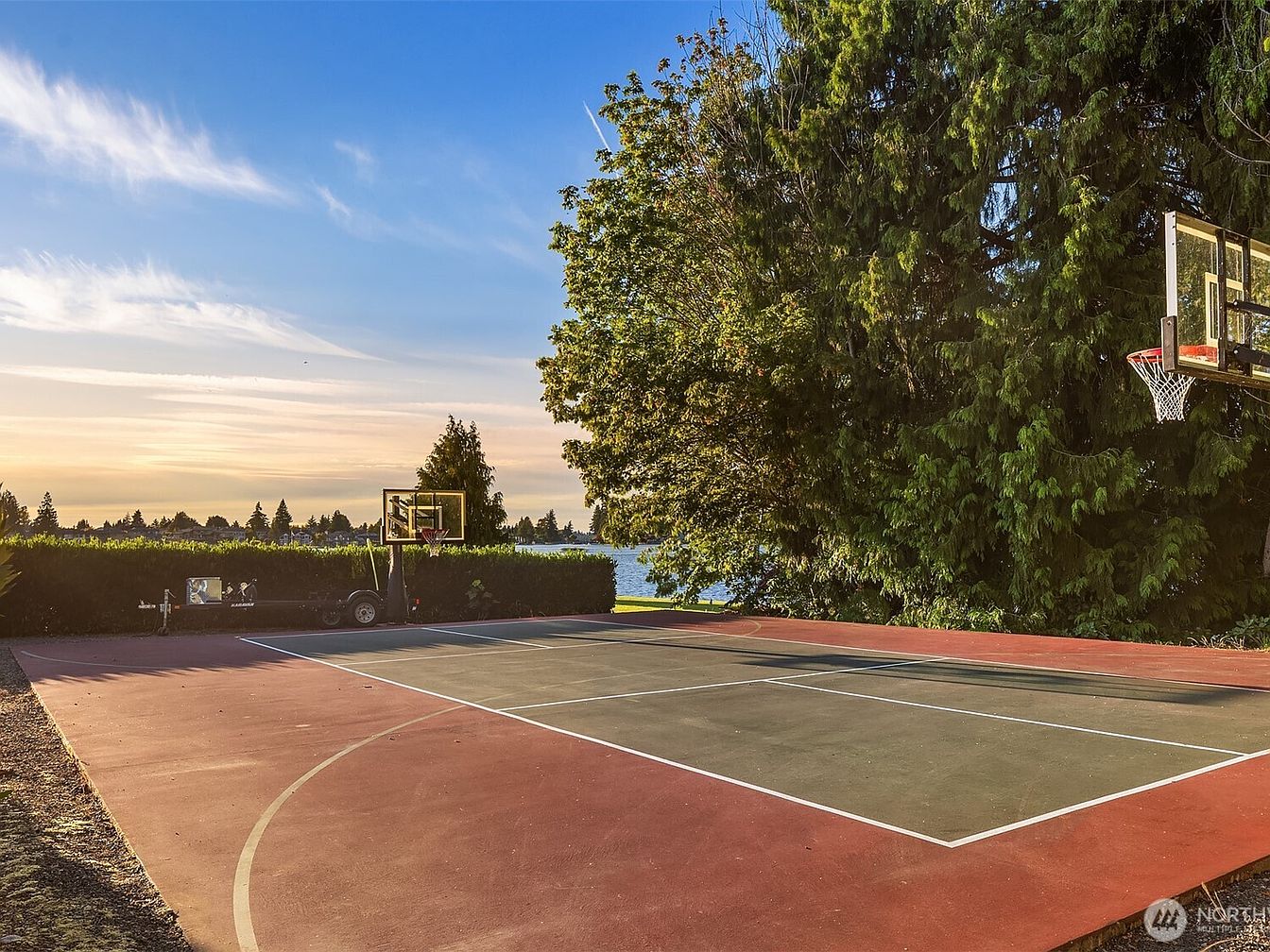 Nestled amidst lush greenery, this outdoor basketball court offers a vibrant space for family fun and fitness. The court features a sleek two-tone surface, combining red and green hues that blend seamlessly with the surrounding nature. A sturdy basketball hoop stands ready for play, ensuring hours of entertainment. This inviting area is perfect for both casual games and serious practice, with ample space for players. The backdrop of tall trees enhances privacy and tranquility, creating a serene atmosphere for active recreation. Enjoy sunset games with picturesque views over the water, making every match a memorable experience.