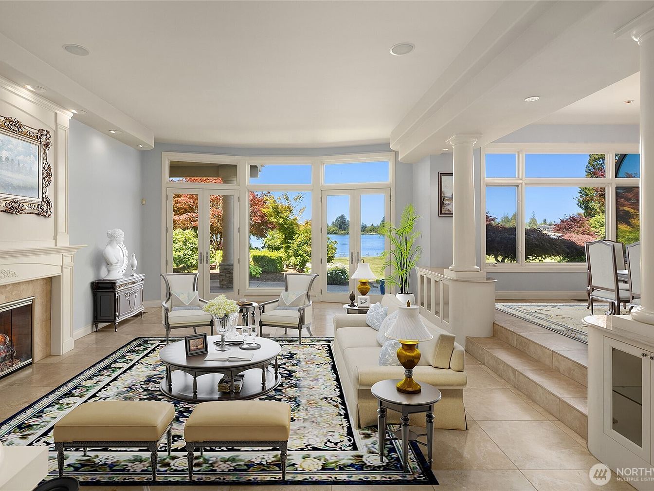 This spacious living room boasts an inviting layout, featuring elegant furnishings and large windows that flood the space with natural light. The neutral color palette, complemented by warm beige and soft gray tones, creates a calming atmosphere, while the intricate area rug adds a touch of sophistication. A cozy fireplace serves as a central focal point, surrounded by classic architectural details, including decorative columns and thoughtful lighting. Family-friendly features include plush seating and a seamless connection to the outdoor views, encouraging relaxation and social gatherings. A blend of contemporary and traditional elements enhances the overall charm of this stylish retreat.