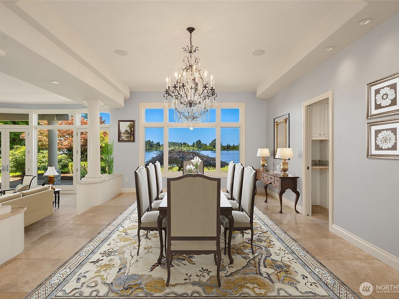 This refined dining area offers a seamless blend of comfort and sophistication, perfect for family gatherings. Soft gray walls complement the elegant chandelier overhead, casting a warm glow across the polished table, surrounded by upholstered chairs. A rich, patterned area rug anchors the space, adding texture and warmth. The generous windows frame picturesque outdoor views, flooding the room with natural light and showcasing vibrant greenery. A tasteful sideboard adds functionality while enhancing the decor with its classic design. This inviting area is designed for both intimate dinners and larger celebrations, reflecting a perfect family-friendly aesthetic.