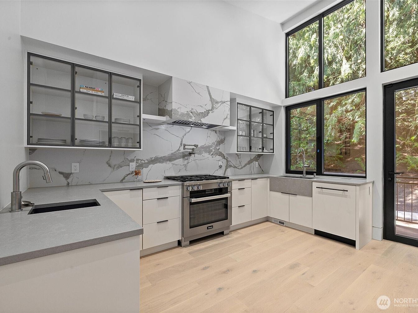Flooded with natural light from expansive black-framed windows, this modern kitchen feels airy and inviting. The open layout maximizes counter space, while sleek cabinetry with glass doors provides both display and storage solutions—ideal for families. The elegant gray and white marble backsplash seamlessly continues above the stove, creating visual continuity. Light wood flooring adds warmth, contrasting beautifully with cool-toned countertops and striking matte hardware. A deep farmhouse sink sits under the view of lush greenery, offering serene outdoor vistas. Ample workspace and a practical island foster cooking and togetherness, making this kitchen a beautiful and functional hub for family life.