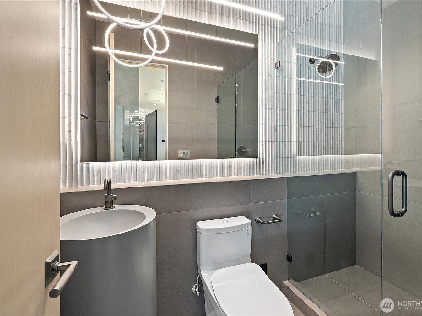 Sleek and sophisticated, this bathroom features a modern floating vanity with a seamless cylindrical basin that adds an artistic touch. The color palette is serene, dominated by soft grays and clean whites, creating a calming ambiance perfect for families. An expansive frameless mirror enhances light and space, complemented by unique geometric pendant lighting and contemporary linear wall lights for added brightness. The walk-in shower includes a glass enclosure for easy access and visibility, while the tiled walls and floors ensure durability and easy maintenance. This well-designed space balances elegance with functionality, making it ideal for both relaxation and everyday family use.