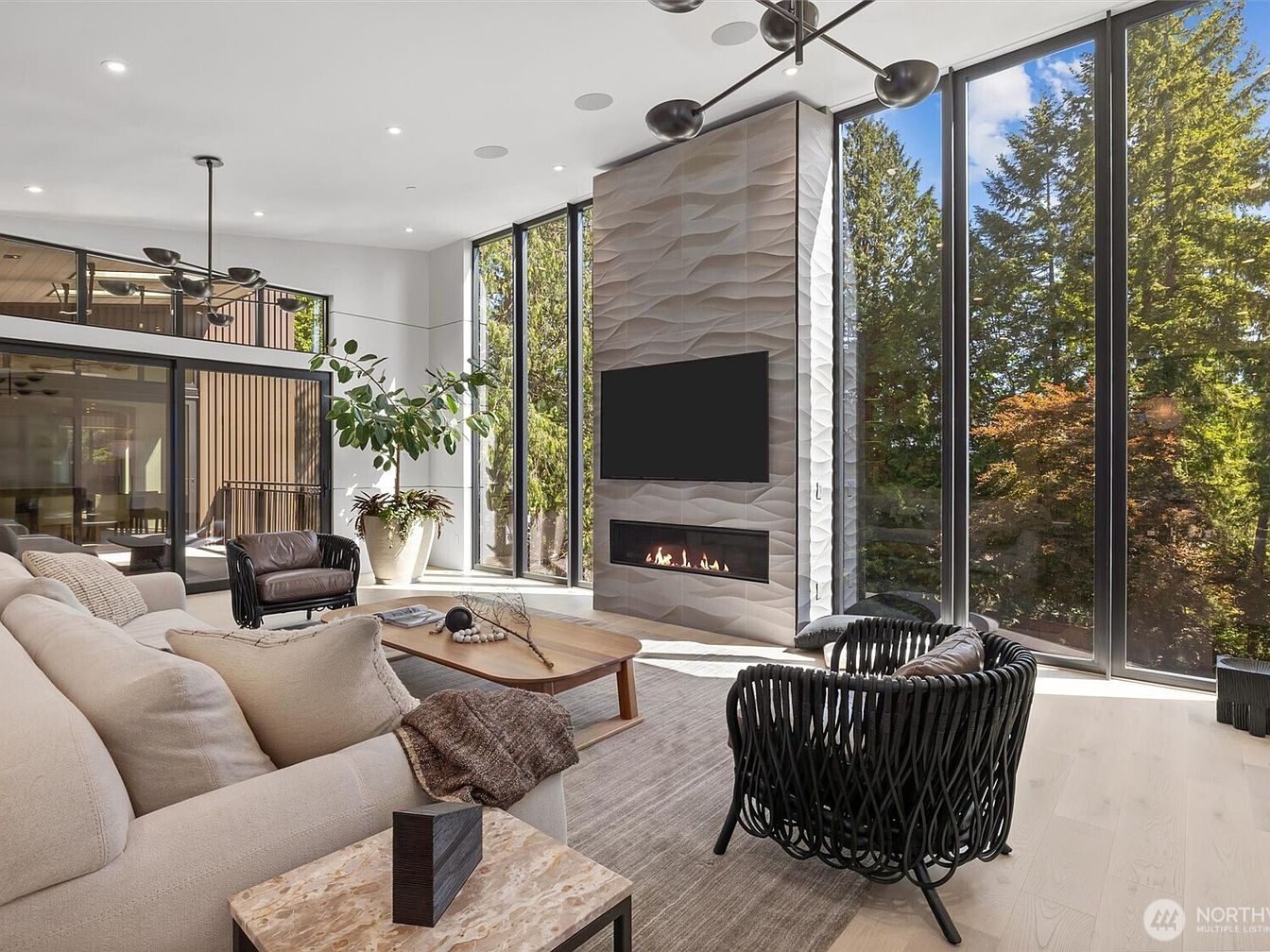 Spacious and filled with natural light, this living room features floor-to-ceiling windows that offer stunning views of the surrounding trees. The layout invites conversation, with a cozy sectional sofa, chic accent chairs, and a modern marble side table. A sleek fireplace and textured feature wall add a touch of luxury, while the neutral color palette of taupe, beige, and black complements the lush greenery indoors and outdoors. Ideal for families, the open space allows for easy movement and gathering, and soft rugs and plush pillows create a comfortable, inviting environment perfect for relaxing or entertaining.
