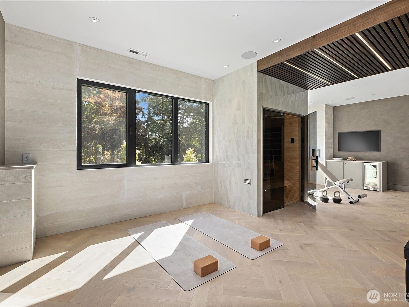 Spacious and filled with natural light, this home gym and sauna area offers a serene environment for health and relaxation. Soft wood tones dominate the herringbone flooring and walls, complemented by minimalist black framed windows that welcome lush green views from outside. Two yoga mats with cork blocks provide a dedicated space for stretching and mindfulness practice, while the far corner features a sleek, adjustable workout bench and free weights for strength training. A glass-fronted sauna with warm wood interior adds a luxurious touch, and the family-friendly layout ensures ample room for safe movement and group wellness activities. Subtle recessed lighting and a modern wood slatted ceiling accentuate the space’s sophisticated yet comforting atmosphere.