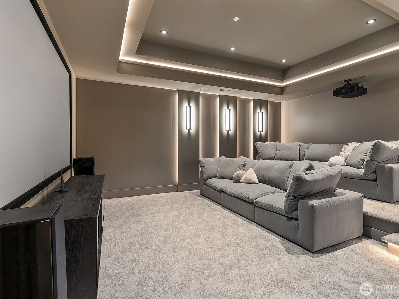 A modern home theater designed for both comfort and style, featuring plush tiered sectional sofas with deep cushions for a cozy family movie night. Soft grey carpeting and matching neutral walls create a calming, immersive atmosphere, while recessed and cove lighting in the ceiling, along with elegant wall sconces, offer a cinematic ambiance without glare. The layout maximizes viewing angles for the expansive wall-mounted screen, making it perfect for gatherings. State-of-the-art audio-visual components and a built-in projector complete the setup, making this space ideal for families to relax and enjoy entertainment together in luxury.