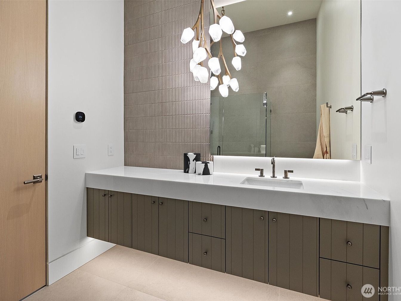 A spacious contemporary bathroom vanity area highlighted by a striking sculptural light fixture and an oversized backlit mirror that visually expands the space. Clean lines dominate the design, with olive green panel cabinetry providing generous storage beneath a thick, white quartz countertop. Subtle textured wall tiles add visual interest behind the sink, while brushed nickel fixtures offer a sleek accent. Soft neutral colors—taupe floors, olive cabinetry, and creamy walls—create a calming palette perfect for family living. The uncluttered design and ample counter space ensure this room remains practical and welcoming for shared use in a modern family home.