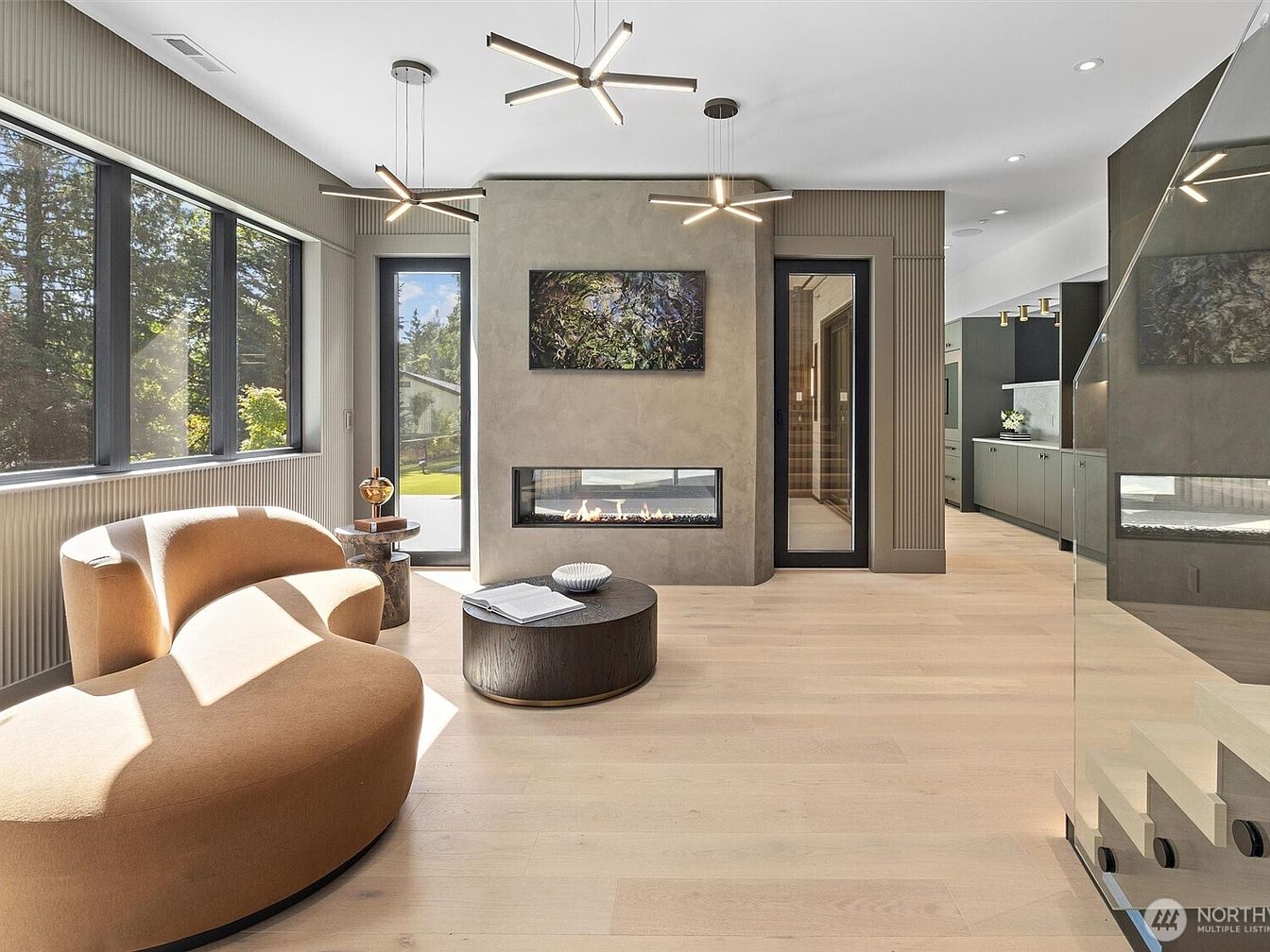 A stunning modern living room designed to maximize natural light with expansive black-framed windows overlooking a lush outdoor view. The space features a sculptural camel-colored sectional sofa offering plenty of cozy seating, ideal for families to gather and relax. A double-sided glass fireplace acts as the room’s centerpiece, enhancing warmth and sophisticated ambience while visually connecting adjacent areas. Sleek light fixtures add a touch of contemporary elegance, while soft beige walls and blond wood flooring anchor the aesthetic. Open sightlines and an uncluttered layout make this a welcoming, safe, and stylish hub for daily family life or entertaining guests.