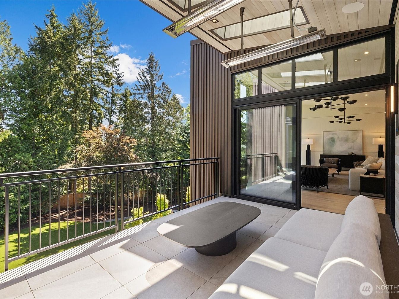 Step onto a spacious, contemporary patio seamlessly connected to an inviting living room through floor-to-ceiling sliding glass doors. The patio features sleek tile flooring and a comfortable outdoor sofa arranged around a minimalist coffee table, perfect for family gatherings or relaxed afternoons. Overhead heaters provide year-round comfort and the wood-paneled ceiling with large skylights fills the space with soft, natural light. The unobstructed view of lush, mature evergreens ensures privacy and a tranquil ambiance. Indoor-outdoor living is embraced with neutral tones that complement both the modern interior and the greenery, making the space ideal for both entertaining guests and relaxing with loved ones.