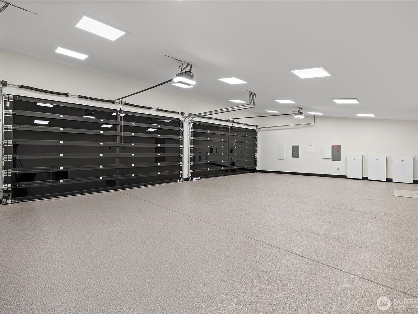 This expansive garage boasts a sleek and modern design with a polished concrete floor that is both practical and easy to clean. The black-paneled double garage doors create a striking contrast against the crisp white walls and ceiling, which are accented by recessed LED lighting for ample brightness. Built-in cabinetry along one wall provides plenty of organized storage for family gear or tools, making it both functional and family-friendly. The uncluttered layout allows for multiple vehicles or flexible usage, such as a workshop or play area. Thoughtful utility panels ensure convenience and safety for everyday living.