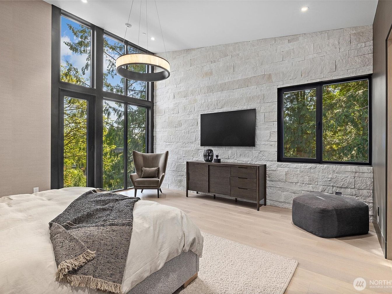 Soaring ceilings and expansive floor-to-ceiling windows fill this bedroom with natural light, offering stunning views of the surrounding trees for a serene, private ambiance. A contemporary stone accent wall brings texture, complemented by light wood floors and a plush area rug for added warmth. The space is anchored by a platform bed with simple, cozy bedding, a wingback chair perfect for reading, and a sleek, dark wood dresser beneath a wall-mounted TV. Thoughtful lighting, soft textiles, and uncluttered layout make this room inviting and family-friendly, ideal for relaxation while easily accommodating personal touches and family activities.