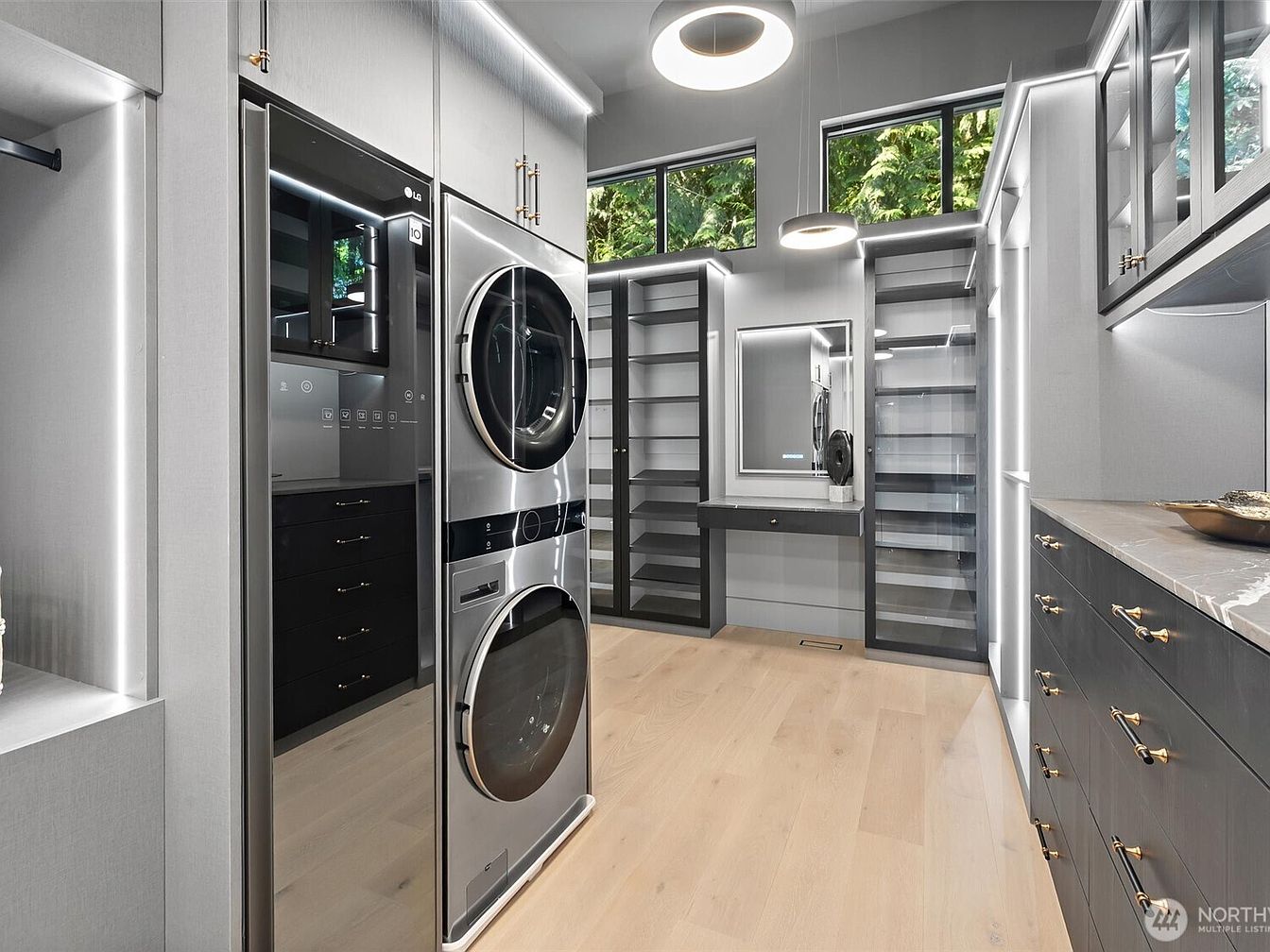 This space blends a state-of-the-art laundry area with a spacious walk-in closet, perfect for busy families seeking convenience and organization. Sleek, modern cabinetry in matte gray is paired with elegant brass hardware, while integrated LED lighting adds sophistication and clarity. The centerpiece is a stacked washer and dryer in premium stainless steel, set beside generous shelving and storage drawers. Built-in cabinetry surrounds a dressing area with a mirror, offering style and practicality. Natural light streams through twin windows, enhancing the airy atmosphere, and pale wood floors tie the entire area together with inviting warmth and elegance.