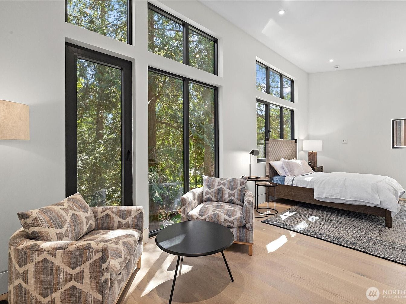 Spacious and serene, this bedroom features expansive floor-to-ceiling windows that invite natural light and frame lush views of the surrounding trees, creating a relaxing retreat. The sitting area is thoughtfully arranged with two patterned armchairs and a modern round coffee table, perfect for reading or quiet conversation. Light hardwood floors and white walls provide a fresh, airy ambiance, while the dark window frames add a touch of modern sophistication. A cozy bed with plush linens rests on a textured area rug, offering family-friendly comfort. Overall, the minimalist decor and open layout foster a sense of calm and connection to nature.