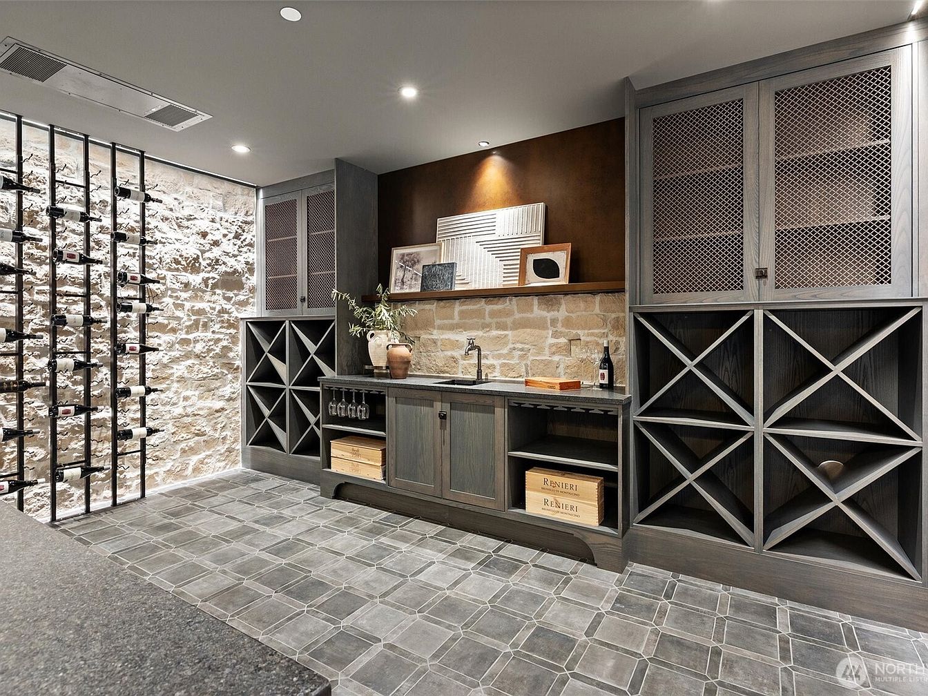 A modern wine cellar blends rustic charm with contemporary design, featuring a stunning stone accent wall illuminated by soft recessed lighting. Floor-to-ceiling wine racks provide ample storage, ideal for collectors and entertainers alike. The cabinetry, finished in deep gray with mesh inlays and open shelving, offers both secure storage and elegant display options. A sleek countertop with an integrated sink and a cozy nook for wine accessories make entertaining seamless. Cool-toned tiles in a grid pattern add durability and style, creating a sophisticated yet family-friendly corner perfect for gatherings or quiet evenings at home.