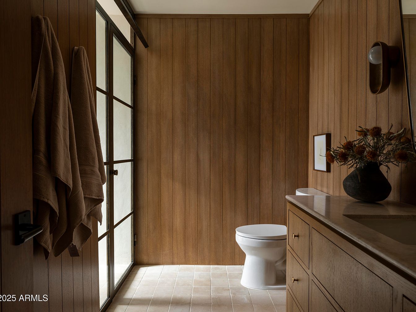 This elegant bathroom features a warm, wood-paneled design that evokes a sense of tranquility and comfort. The rich, natural tones are complemented by sleek, modern fixtures, including a smooth countertop and a contemporary toilet. A spacious shower area with a glass door maximizes light and creates an open feel. Soft, plush towels hang nearby, inviting relaxation after a long day. Decorative elements, like a simple art piece and an earthy vase of dried flowers, enhance the inviting atmosphere. The combination of textures, from the wood to the ceramic, unites practicality with aesthetic appeal, perfect for a family-friendly home.