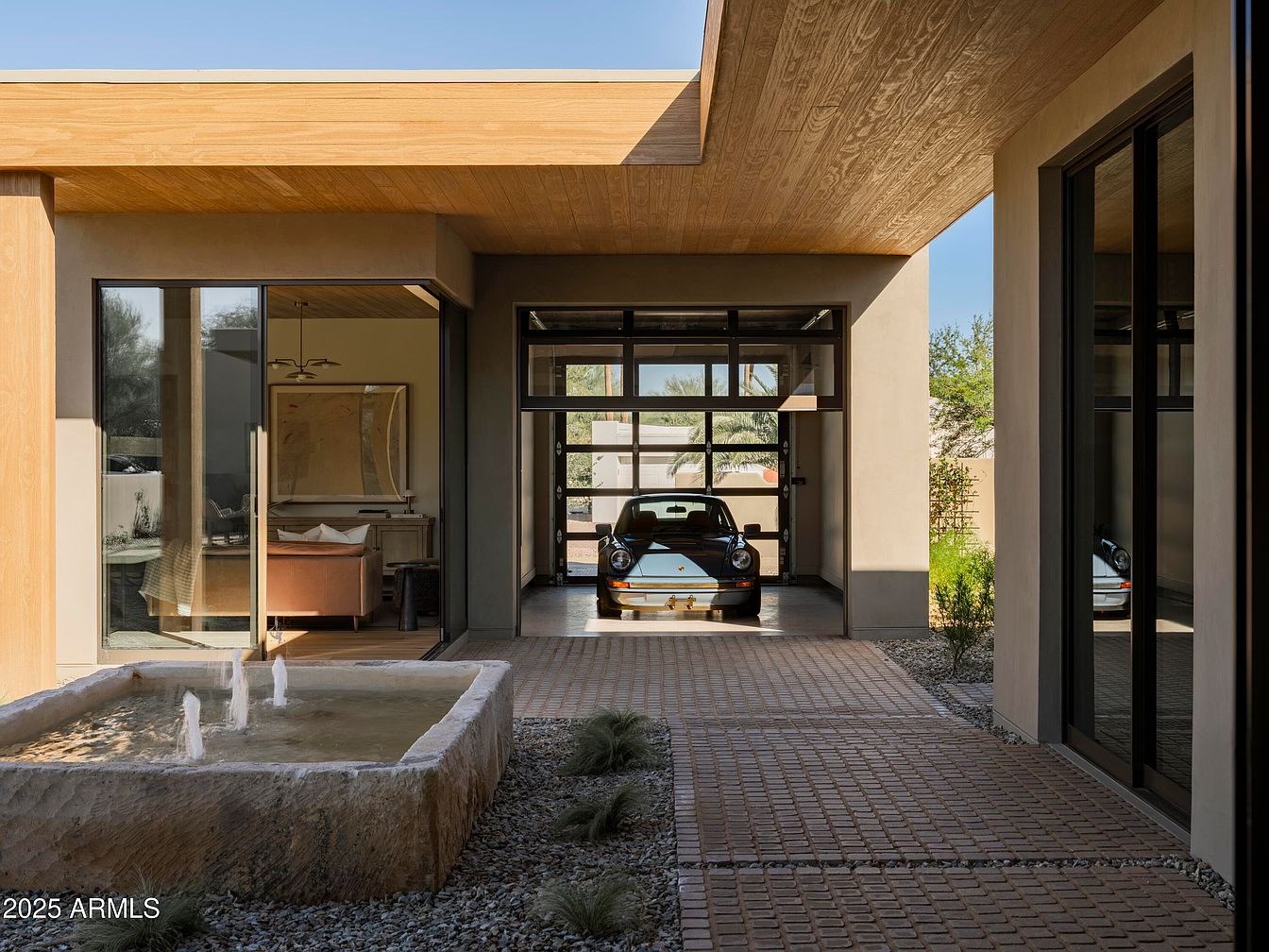 A striking entryway seamlessly blends indoor and outdoor spaces, featuring a minimalist design with modern architectural lines. The tranquil water feature adds a soothing ambiance, while the textured stone pathways lead to a stylish interior. Sunlight floods through expansive glass panels, illuminating a contemporary seating area adorned with soft furnishings in neutral tones. The warm wooden ceiling contrasts beautifully with the sleek concrete walls, creating an inviting atmosphere. This entryway not only exudes sophistication but also offers practical features like easy access to the garage, making it ideal for family living and entertaining.