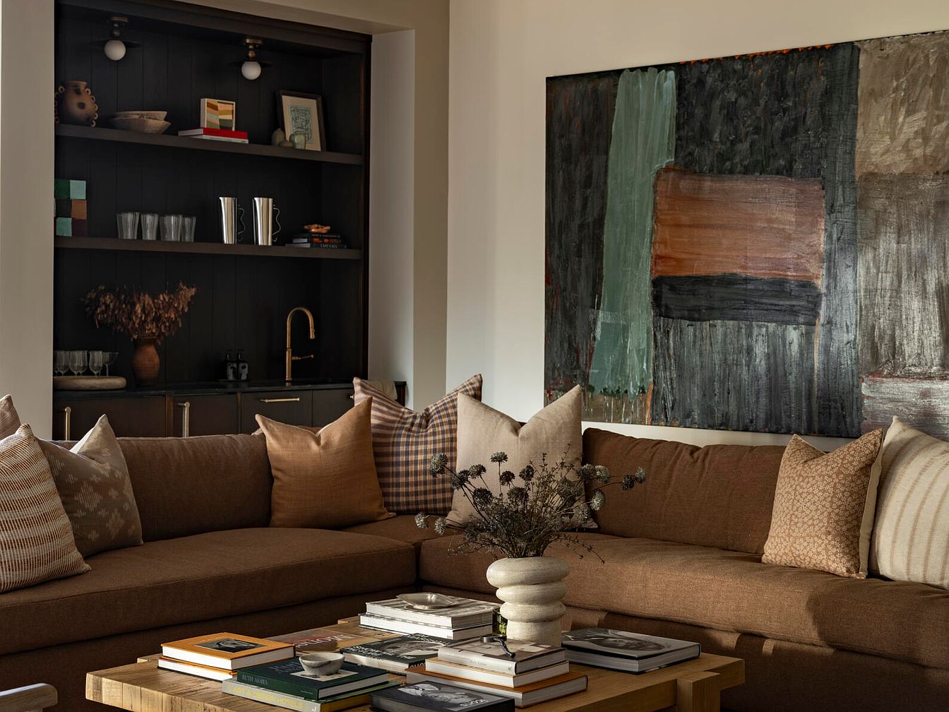 This inviting living room features a spacious sectional sofa adorned with a mix of textured pillows, creating a warm and comfortable atmosphere. The rich brown tones of the sofa harmonize beautifully with the earthy color palette of the room. A large abstract painting captures attention on the wall, adding a touch of modern art. A stylish wooden coffee table holds an assortment of books and decorative objects, perfect for cozy family gatherings. Behind the sofa, a sleek dark wood shelf showcases tasteful décor and glassware, complemented by elegant wall lighting. This space is designed for relaxation and togetherness.