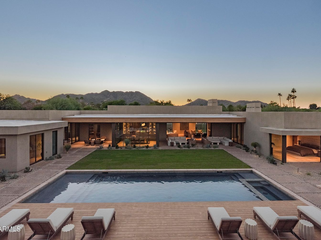 Desert Muse, a modern luxury home completed in 2023, stands as a beacon of contemporary architectural excellence in Paradise Valley, Arizona, priced at $15,500,000. Spanning 7,769 square feet on a one-acre lot, its design by Cosan Studio harmonizes modern lines with organic materials, embodying success and innovation. The residence features four bedrooms, seven bathrooms, an office, and a casita, all designed for comfort and style. With sweeping mountain views and expansive glass doors that merge indoor and outdoor spaces, it offers a serene, resort-like atmosphere with lush landscaping and multiple patios. Its recent completion and attention to detail make it an ideal investment for the future-focused homeowner.