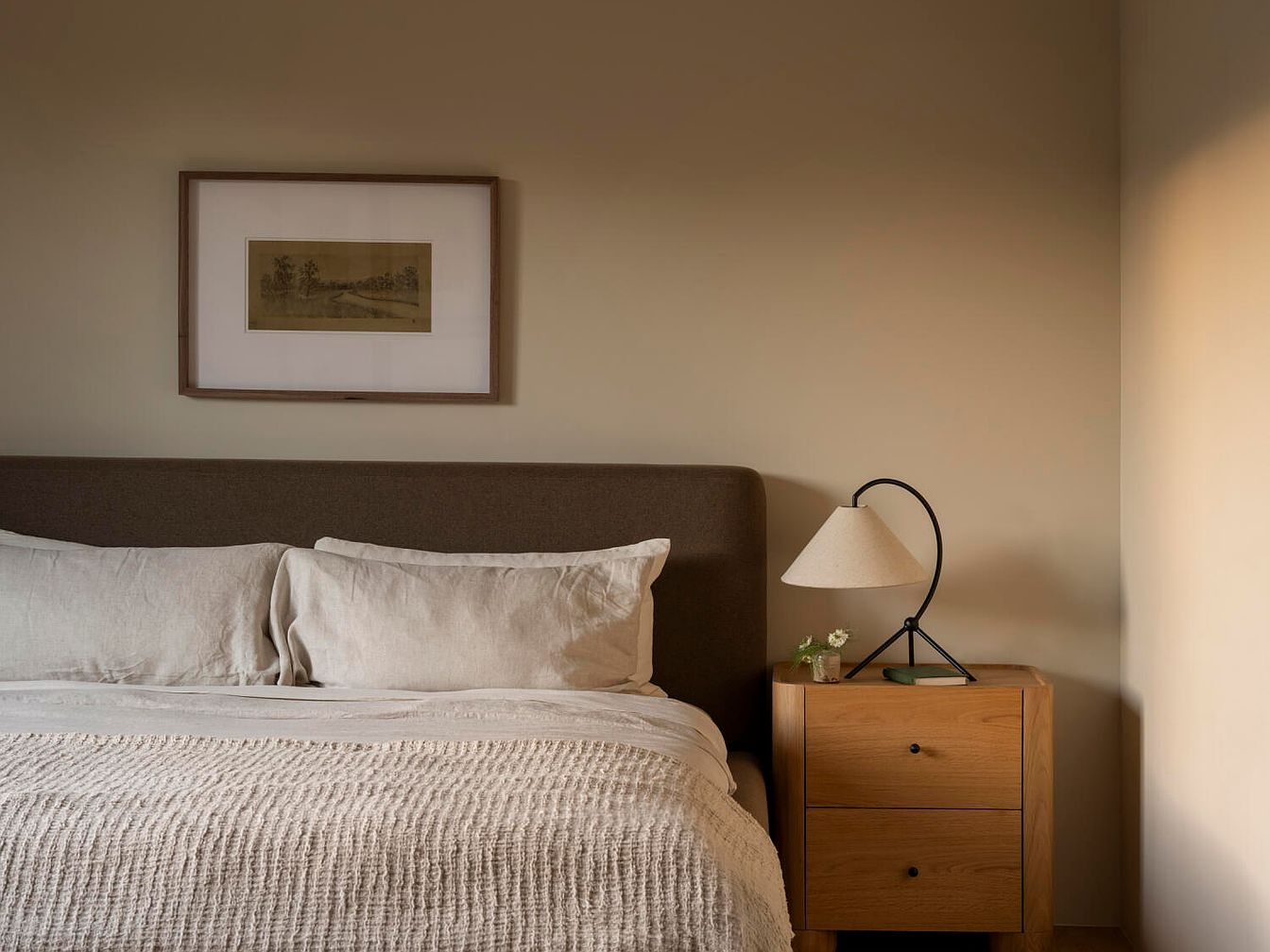 This serene master bedroom combines comfort and style, featuring a cozy upholstered headboard that provides a soft backdrop for restful nights. Neutral tones envelop the space, creating a calming ambiance complemented by natural fabrics. The eco-friendly wooden nightstand showcases minimalist design with subtle storage, enhanced by a sophisticated sculptural lamp. Soft linen bedding invites relaxation, while the textured throw adds warmth and elegance. A carefully framed landscape artwork graces the wall, infusing the room with artistic charm. This inviting retreat emphasizes functionality and aesthetics, making it perfect for families seeking a tranquil space to unwind.