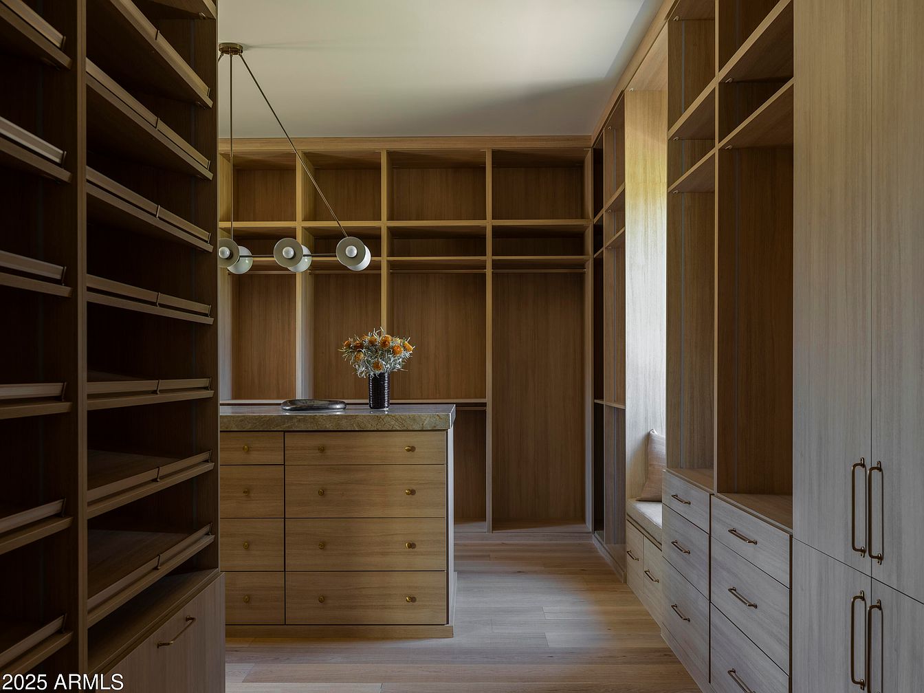 This walk-in closet showcases a seamless blend of functionality and style, featuring an expansive layout designed for optimal organization. Natural wood finishes provide warmth and elegance, complemented by a sleek countertop and decorative flower arrangement that adds a personal touch. The thoughtfully arranged shelves and drawers ensure ample storage for clothing and accessories, promoting a clutter-free environment. A modern pendant light illuminates the space, highlighting the rich textures of the cabinetry. With a cozy window nook positioned for comfort, this closet exemplifies both a practical and inviting atmosphere, making it a perfect retreat for daily routines.