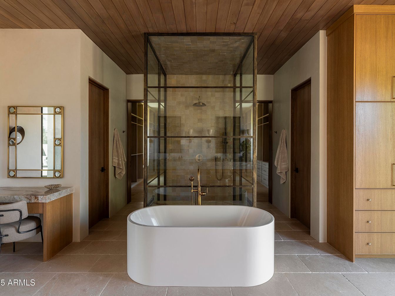 This exquisite bathroom showcases a seamless blend of modern elegance and functionality. The focal point is a freestanding, sculptural bathtub, inviting relaxation and tranquility. Warm wooden accents in the ceiling and cabinetry add a touch of nature, while the neutral color palette creates a serene atmosphere. Glass enclosure for the shower enhances openness, allowing light to flow through, and the textured stone tiles provide a stylish contrast underfoot. Ample storage options, including custom cabinetry, promote organization while maintaining an uncluttered feel. Thoughtful design elements like the chic vanity mirror and plush bath textiles ensure comfort and style, perfect for family living.