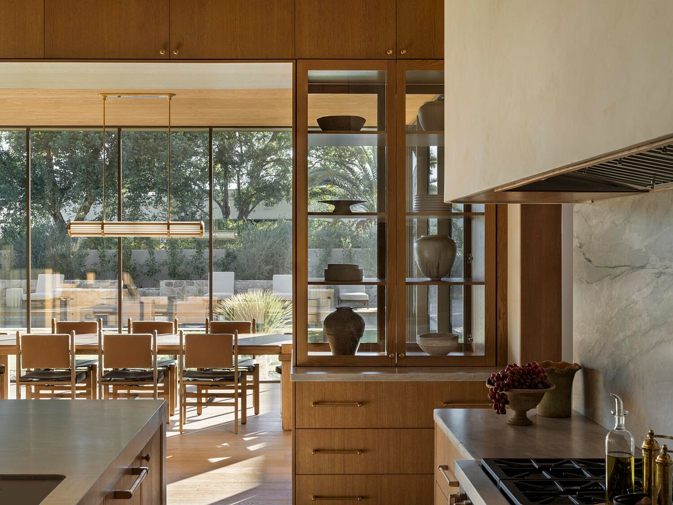 This modern kitchen balances functionality and style with its open layout. Natural light floods through expansive glass windows, offering a seamless view of the outdoor space, enhancing the inviting atmosphere. The warm wood cabinetry complements sleek marble countertops, creating a harmonious blend of materials. A striking pendant light hangs above the central island, providing ample illumination for meal preparation. Stylish dining chairs surround a long table, perfect for family gatherings. Thoughtful storage solutions, including glass cabinetry, display elegant dishware, while subtle color palettes of beige and earthy tones create a serene environment, ideal for culinary creativity and family bonding.
