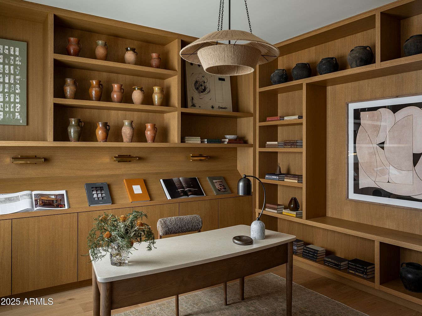A contemporary home office showcases warm wood tones and a serene ambiance, enhancing productivity and comfort. The wall-mounted shelving displays an impressive collection of artisanal pottery and curated books, adding character and personalization. A sleek, minimalist desk is paired with a unique chair, perfect for long work sessions. Illuminated by a stylish pendant light, the space features a harmonious color palette of earthy browns and soft neutrals, contributing to a tranquil atmosphere. Thoughtfully integrated storage solutions keep the area tidy, making it an inviting retreat for creativity and focus in an organized family-friendly environment.