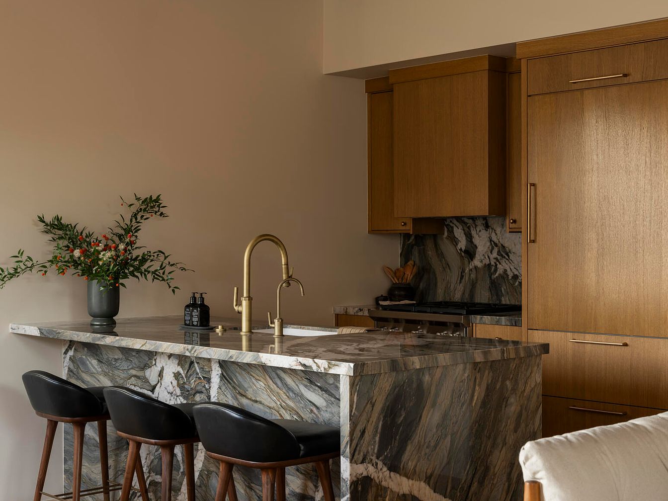 This contemporary kitchen showcases a stunning marble countertop that elegantly contrasts with warm wooden cabinetry, creating an inviting atmosphere. The spacious layout features a sleek island with stylish bar stools, ideal for family gatherings or casual meals. A chic brass faucet complements the sophisticated color palette, while a tasteful arrangement of greenery adds a natural touch. The cabinetry is thoughtfully designed, maximizing storage while maintaining a streamlined look. The combination of rich textures and soft hues not only enhances functionality but also fosters a welcoming environment, perfect for cooking and entertaining loved ones.