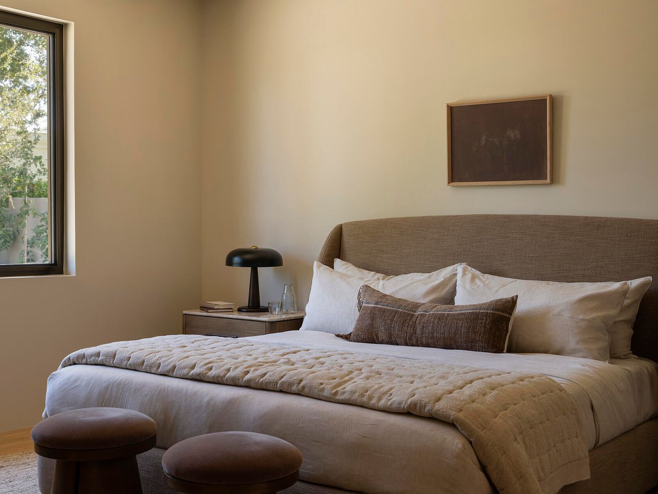 This tranquil master bedroom features a harmonious blend of comfort and sophistication. The spacious layout is anchored by a plush bed adorned with luxurious layers of bedding, including a textured throw and an array of pillows for added coziness. Natural light pours in through a large window, showcasing serene outdoor views and enhancing the soft neutral color palette of beige and warm whites. Minimalist wooden furniture complements the soothing ambiance, while a modern lamp adds a touch of elegance. Cozy stools provide additional seating, making this an inviting retreat for relaxation and restful sleep.