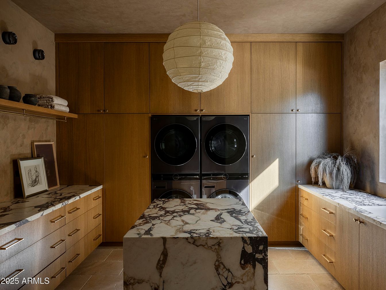This laundry room showcases a sophisticated blend of functionality and style, with sleek cabinetry offering ample storage space. The warm wood finishes harmonize beautifully with the elegant marble countertops, providing a polished look while enhancing durability. A striking pendant light adds a touch of modern whimsy, illuminating the space and creating a welcoming atmosphere. The carefully arranged laundry appliances, paired with the clean lines of the cabinetry, contribute to an organized environment. Textured accents, such as draped towels and decorative vases, introduce a cozy, family-friendly vibe, making this room not just utilitarian, but aesthetically pleasing as well.