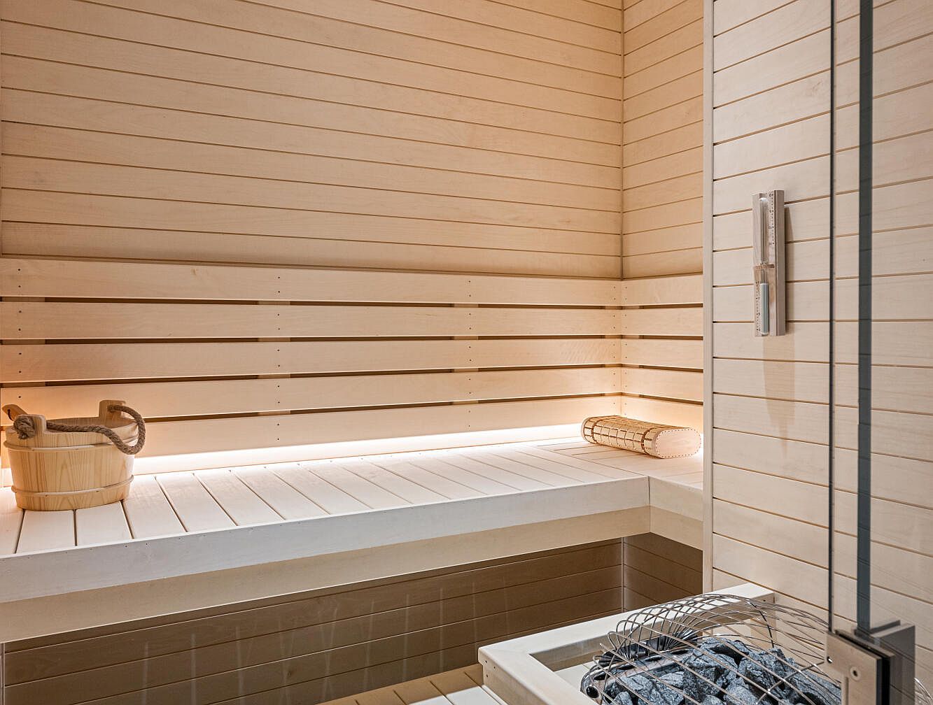 This inviting home sauna offers a tranquil retreat with its seamless light wood paneling and built-in bench seating that runs along the walls, providing ample space for relaxation. Soft, indirect lighting beneath the bench enhances the calming atmosphere, while the glass door and minimal hardware contribute to a clean, contemporary look. A classic wooden pail and scoop rest in one corner, highlighting tradition within a modern design. The sauna’s ergonomic details, like a headrest and gentle lines, make it family-friendly, offering a soothing environment for all ages to unwind and enjoy wellness together.