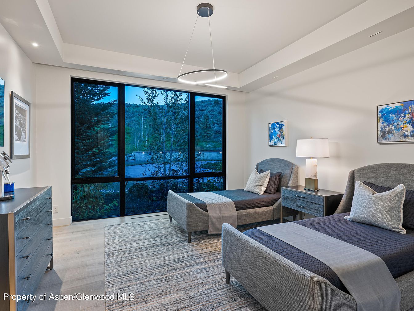 This thoughtfully designed guest bedroom features two elegant twin beds with upholstered headboards, each accented with plush, patterned pillows and cozy bedding in deep navy and soft gray tones. The expansive floor-to-ceiling windows frame serene natural views, creating a tranquil atmosphere and inviting plenty of daylight. A contemporary area rug and sleek furnishings, including a nightstand and dresser in matching gray finishes, add cohesion and sophistication. Abstract art and modern lighting highlight the room’s clean lines and airy feel. The layout provides both comfort and privacy, making it an ideal space for families, siblings, or visiting friends.