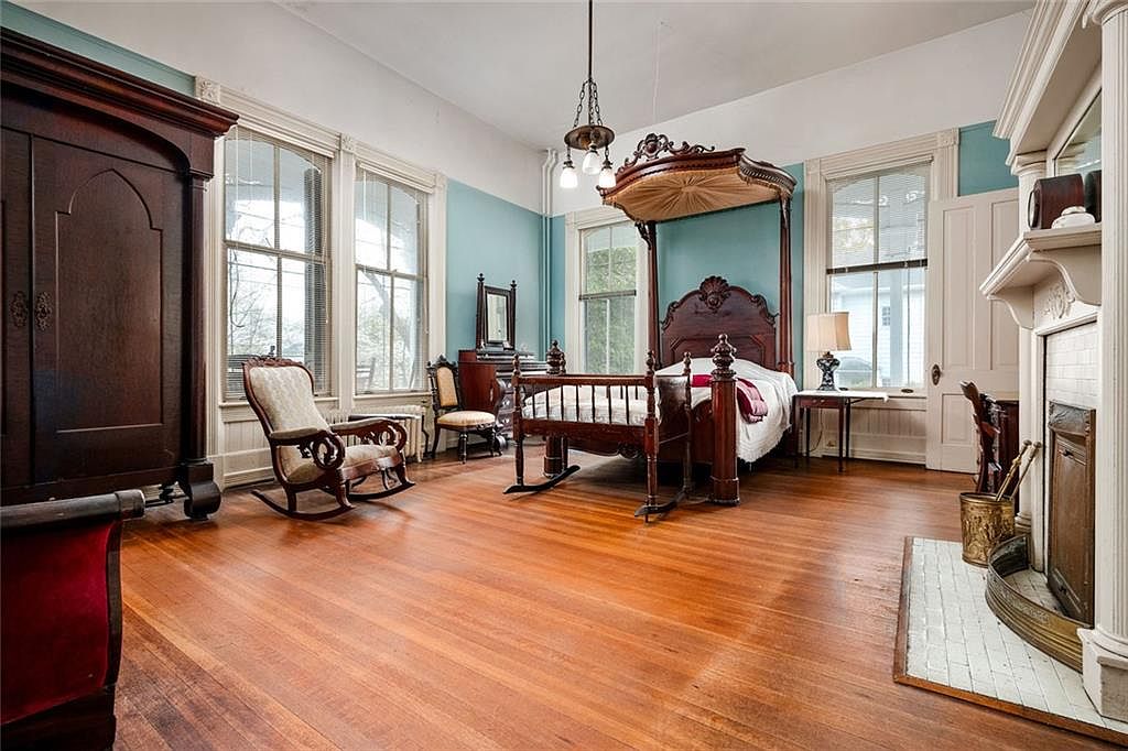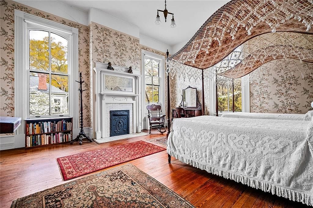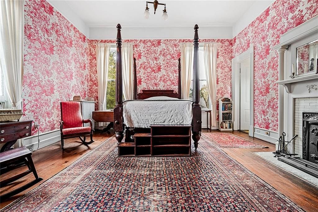 This inviting bedroom features a grand four-poster canopy bed draped in beautifully textured netting, blending vintage elegance with cozy comfort. Large windows with classic trim flood the space with natural light, framing lovely views of treetops and neighborhood charm. The fireplace, with its ornate mantel and decorative tilework, adds warmth and a focal point. Floral wallpaper, rich wood floors, and layered rugs create a harmonious, heritage-inspired atmosphere. Thoughtful details—like the bookshelf, antique vanity, and ample open layout, invite relaxation and family-friendly living, making this room an inspiring example of timeless yet functional design.