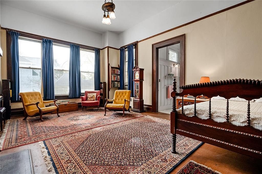 This spacious bedroom features large windows adorned with rich blue drapes, welcoming abundant natural light and framing a charming bay seating area. Vintage mustard armchairs and a cozy red accent chair provide a perfect corner for reading or family conversation, while a grand antique rug anchors the room with warmth and texture. Ornate wood furniture, including a striking spindle bed and a classic grandfather clock, adds timeless elegance. The soothing beige walls, original wood trim, and soft accent lighting create a family-friendly atmosphere, ideal for relaxation and togetherness. Built-in bookshelves invite quiet evenings and shared stories.