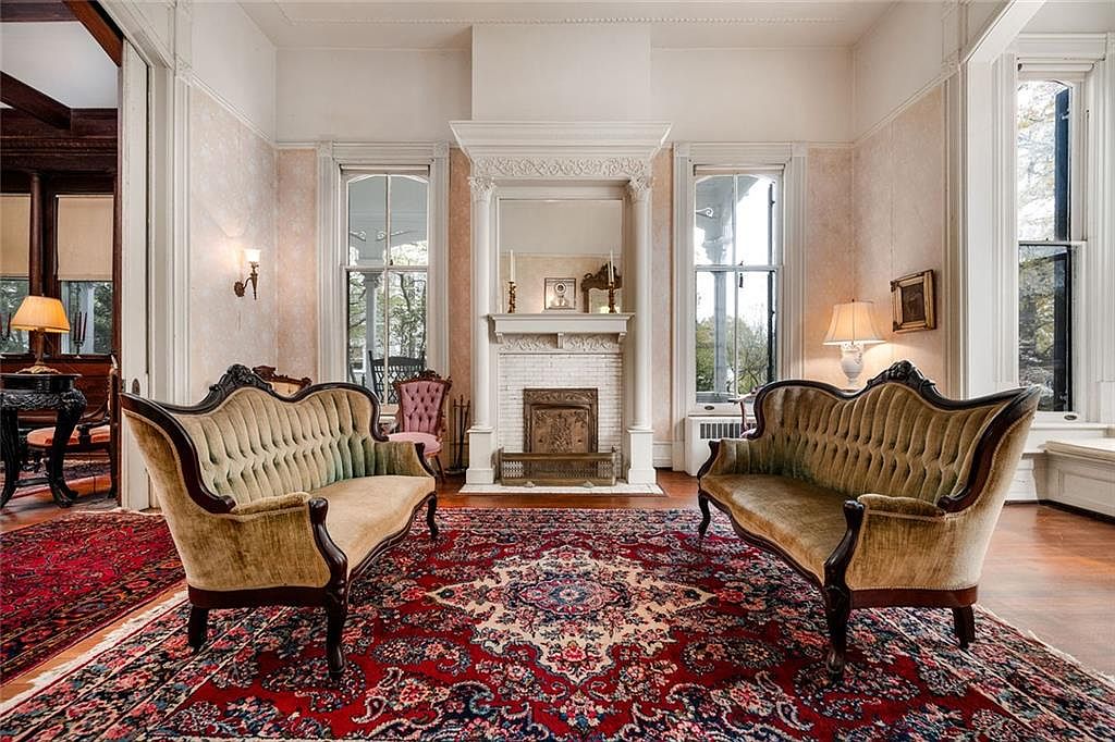 This elegant formal living room features high ceilings, large sash windows, and intricate crown molding, creating a bright and open atmosphere. Two matching Victorian-style velvet sofas face each other on a richly patterned Persian rug, with a white, detailed fireplace as the focal point. The space is defined by classical details, including wide baseboards and delicately embossed wall treatments. Family friendly with ample seating, the inviting arrangement encourages gatherings and conversation. Soft pastel wall colors and warm wood floors pair beautifully with the refined antique furniture, while traditional lamps and soft lighting enhance the room’s welcoming, heritage-inspired ambiance.