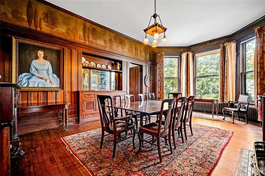A grand, traditional dining room featuring rich wood paneling, intricate built-in cabinetry, and classic period molding. The elegant, elongated dining table is surrounded by matching wooden chairs, ideal for family gatherings and celebrations. Large bay windows fitted with golden drapes allow natural light to pour in, creating an inviting atmosphere and providing scenic views. An ornate patterned rug anchors the space, complementing the warm tones of the hardwood floors. The room is accented by decorative plates, vintage artwork, and a distinctive portrait, providing a touch of heritage charm and sophistication to this family-friendly setting.