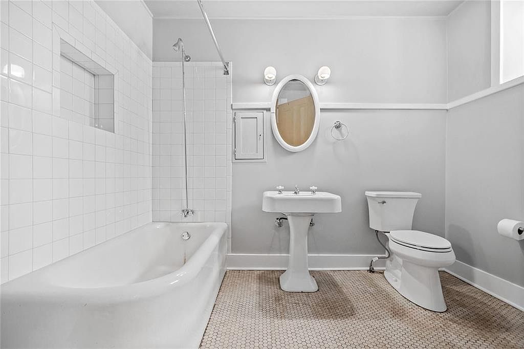 A bright and inviting bathroom featuring a traditional white color palette, offering a sense of cleanliness and spaciousness. The room boasts a deep, porcelain bathtub with a tiled shower surround and built-in niche for storage convenience. A pedestal sink and oval mirror create a timeless look, flanked by double vanity lights for ample illumination. The classic hexagonal tiling on the floor complements the simple, elegant white walls. Thoughtful touches, like towel and toilet paper holders, ensure functionality for a family setting, while the window provides natural light, keeping the space fresh and welcoming for daily routines.