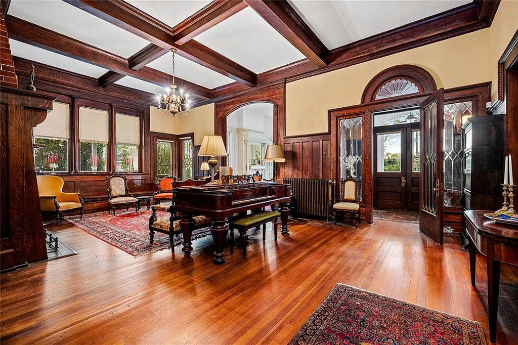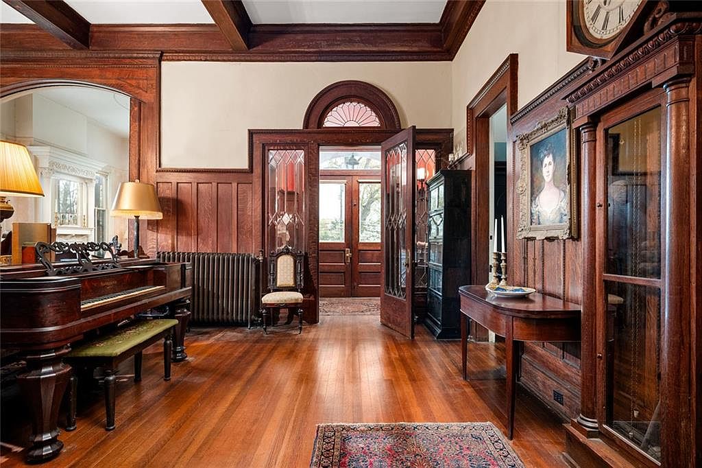 Warm hardwood flooring and intricate wood paneling create an inviting atmosphere in this grand foyer adjacent to a parlor area. Large, arched double doors with decorative glass lead to the entryway, providing ample natural light and a sense of arrival. A vintage piano and classic furniture pieces offer elegant family gathering spaces, while tall ceilings with exposed beams enhance the room’s spaciousness. Rich earth tones pair with soft neutral walls, and period accents like the portrait, clocks, and ornate cabinetry add historical charm. The layout encourages social interaction and suits both quiet evenings and lively family get-togethers.