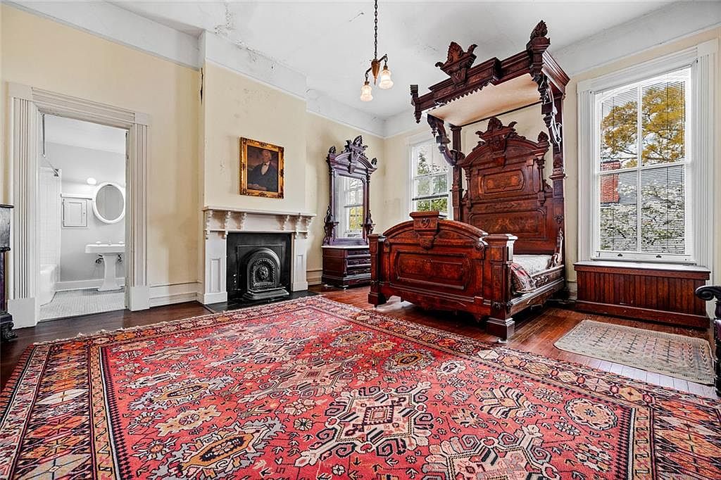 A stunning Victorian bedroom showcases ornate, dark wood furniture, with a standout intricately carved canopy bed as the centerpiece. Massive windows line the walls, inviting ample natural light and offering serene views, while white trim adds classic contrast to the soft, pale yellow walls. The hearth and mantel evoke historic charm, and a rich, patterned oriental rug creates a warm, welcoming foundation for family life. The airy layout leaves plenty of space for kids to play or lounge together, and easy access to an adjoining bathroom elevates daily comfort. The space blends elegance with timeless, family-friendly function.