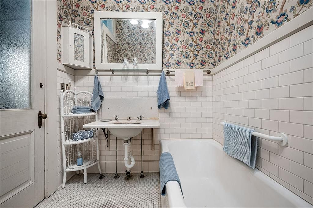 A welcoming, family-friendly bathroom featuring a classic white clawfoot tub and pedestal sink, accented by gleaming white subway tiles that extend halfway up the walls for easy cleaning and timeless appeal. Soft blue towels and delicate touches provide hints of color against the charming floral wallpaper, which adds warmth and personality. Practical elements include towel racks within easy reach for little ones, a sturdy white door with frosted glass for privacy, and a durable hexagonal mosaic floor. A corner wicker shelf enhances storage for toiletries, making this space both functional and inviting for family routines.