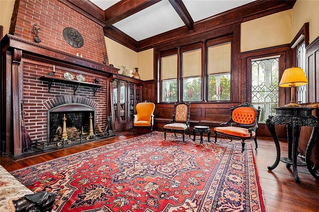 Warmth and tradition blend seamlessly in this inviting sitting area, featuring a striking brick fireplace as the focal point of the space. Rich wood paneling and detailed trim offer an elegant backdrop, enhanced by large windows and classic stained glass, flooding the room with natural light. The plush, patterned area rug anchors comfortable vintage seating, ideal for family conversations or quiet reading. Thoughtful details like built-in glass-front cabinetry and a unique, ornate side table add to the sophisticated yet welcoming feel. Soft golden walls and warm accent lighting create a cozy, timeless environment perfect for gatherings or relaxation.