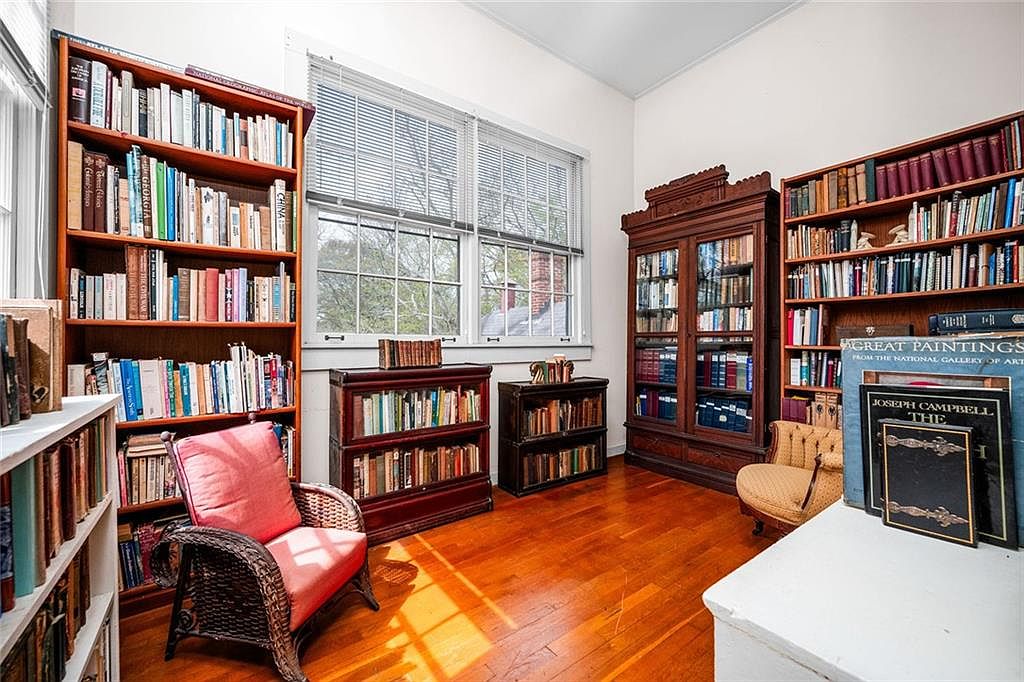 Brightly lit by large windows, this inviting home library offers natural sunlight ideal for reading or relaxing with the family. Timeless wood bookshelves line the walls and reach toward the ceiling, stocked with a vibrant assortment of books. A woven reading chair with a soft red cushion provides a cozy spot for children or adults alike. Antique furnishings, including a glass-fronted cabinet and a tufted accent chair, add a classic, welcoming touch. Polished hardwood floors and soft neutral wall colors create a soothing, organized environment that encourages learning, conversation, and quiet moments together, making it a wonderful family-friendly retreat.