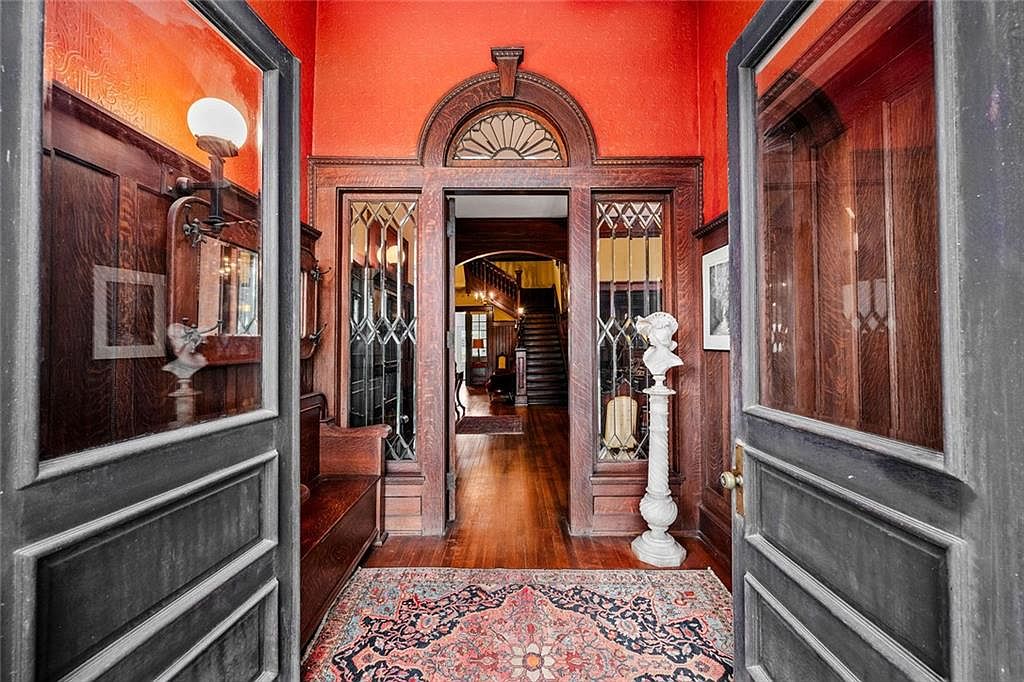 Warm wood paneling and intricate glasswork welcome visitors into this inviting front entryway. The space boasts rich, reddish-orange walls that provide an energetic pop of color, nicely offset by dark-stained doors and wainscoting. A patterned area rug anchors the room, offering a cozy first impression. Period details, like the leaded-glass sidelights flanking the corridor and a grand staircase, create a sophisticated yet welcoming atmosphere. Practical built-in benches and ample entry space make it ideal for family comings and goings, while decorative statues and detailed lighting add charm and historic character, reflecting the home’s timeless appeal.