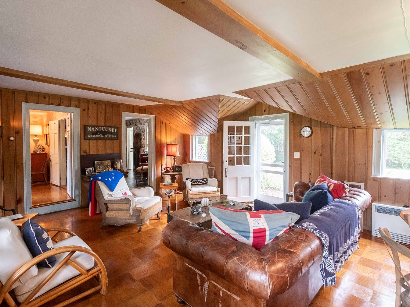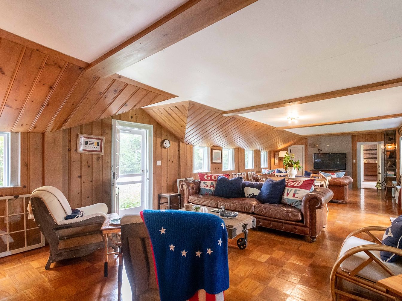 Warm wood paneling and exposed beams create a cozy, inviting atmosphere in this family living room, ideal for relaxing or entertaining. A plush, brown leather sectional sofa anchors the space, topped with vibrant throw blankets and pillows in patriotic prints, lending a friendly, Americana vibe. Armchairs cluster nearby, providing extra seating options and a touch of vintage charm. Natural light streams through multiple windows and a glass-paned door, brightening the room and highlighting the garden views. The open layout, accessible through wide doorways, enhances connectivity, perfect for gatherings. Tasteful accents and family-friendly furnishings make it both practical and welcoming.
