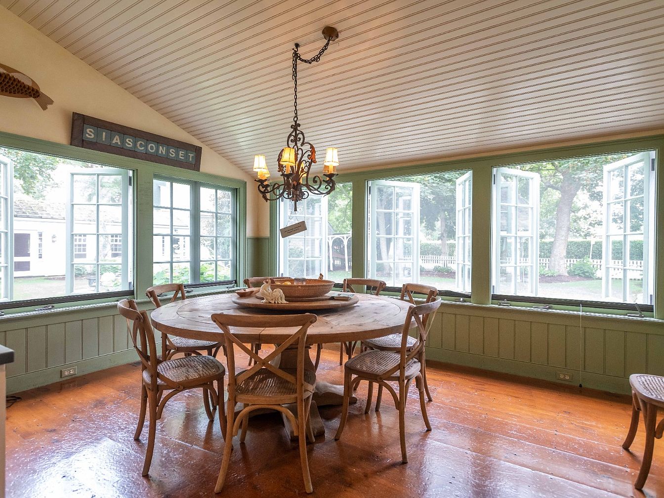 Sunlight floods this inviting breakfast nook, where a circular wooden table is surrounded by six rustic chairs, fostering togetherness for family meals or morning gatherings. Large windows on three sides open wide to reveal lush outdoor views, creating an airy, garden-like ambiance. The sage green trim and beadboard wainscoting pair harmoniously with the warm, honey-colored hardwood floors. A wrought-iron chandelier hangs above, adding a touch of vintage charm and elegance. The room’s open sightlines and relaxed style encourage lingering conversations and easy movement, making it an ideal space for families to share both meals and memories.