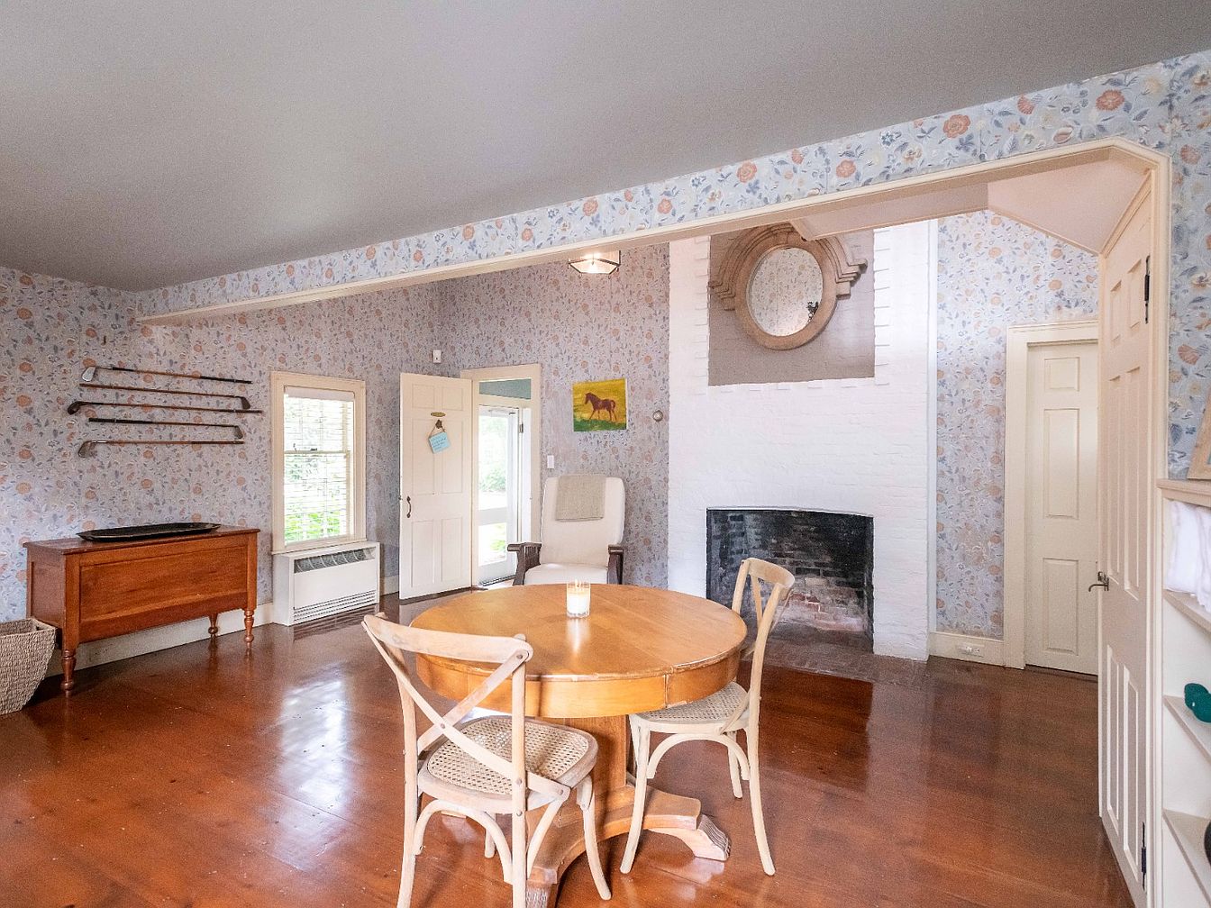 A bright and welcoming dining area features prominently with a round wooden table and matching chairs set on rich, polished hardwood floors. The floral wallpaper in soft pastel tones gives the space a cheerful yet timeless charm, while ample natural light streams through the windows, enhancing its inviting atmosphere. A white painted brick fireplace with an elegant circular mirror above creates a warm focal point, perfect for family gatherings. The layout is open and easy to navigate, making it ideal for both daily life and entertaining. Subtle artwork, vintage wooden accents, and cozy nooks add to the homey ambiance.