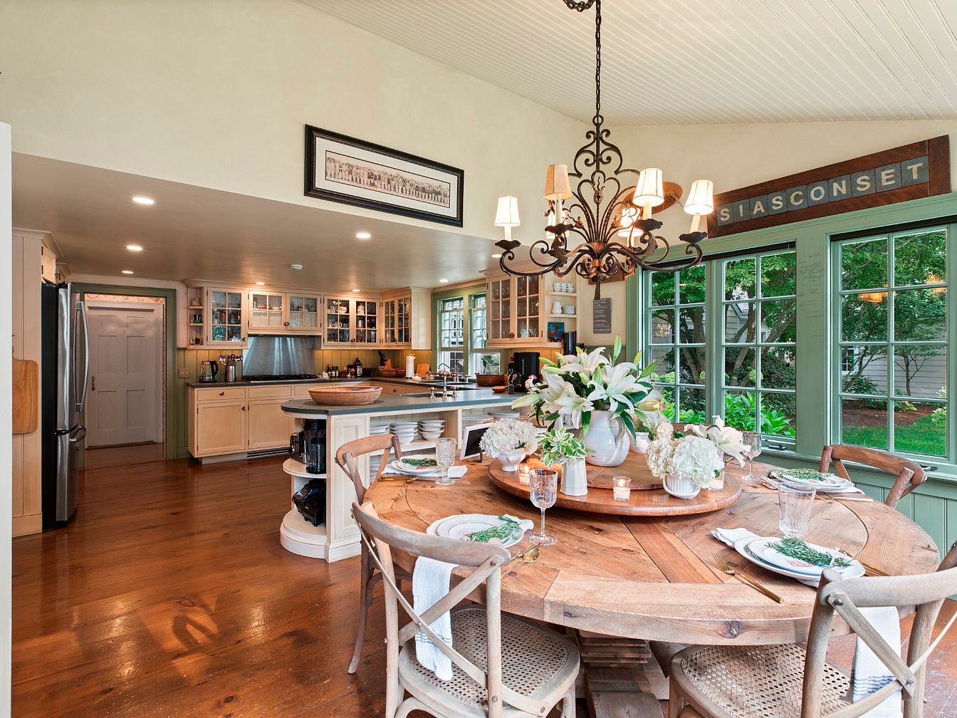 A welcoming open-plan kitchen and dining space bathed in natural light from generous green-trimmed windows, offering views of the lush outdoor scenery. Warm, honey-toned hardwood floors flow throughout, complemented by cream cabinetry and glass-paneled doors for easy access to kitchen essentials. The rustic wooden dining table easily accommodates a family gathering, arranged with elegant floral centerpieces and classic table settings. Overhead, a wrought-iron chandelier adds a touch of traditional charm. This inviting area is perfect for family meals, homework sessions, and entertaining, balancing comfort, style, and functionality in a relaxed yet sophisticated environment.