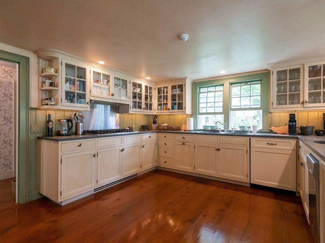 Warm and inviting, this farmhouse-style kitchen features soft cream cabinetry with glass-fronted upper doors, offering a showcase for dishware while keeping essentials within easy reach. Wide-plank wooden floors and sage-green trim create a cozy, family-friendly feel. The layout maximizes counter space for meal preparation, and the large windows above the sink flood the room with natural light. Built-in appliances, open shelving for daily items, and under-cabinet lighting enhance the kitchen’s functionality. This space balances rustic charm with practicality, making it perfect for cooking together, entertaining, or gathering for casual family meals.